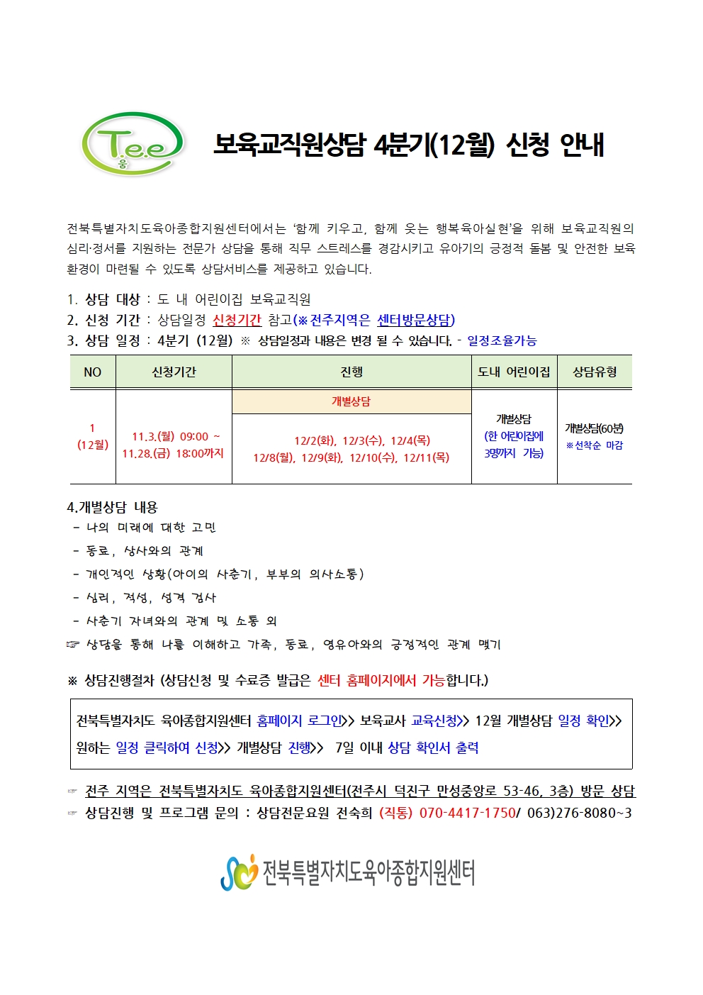 [전북센터] 보육교직원 상담 [T.e.e.움] 12월 개별 상담 신청안내
